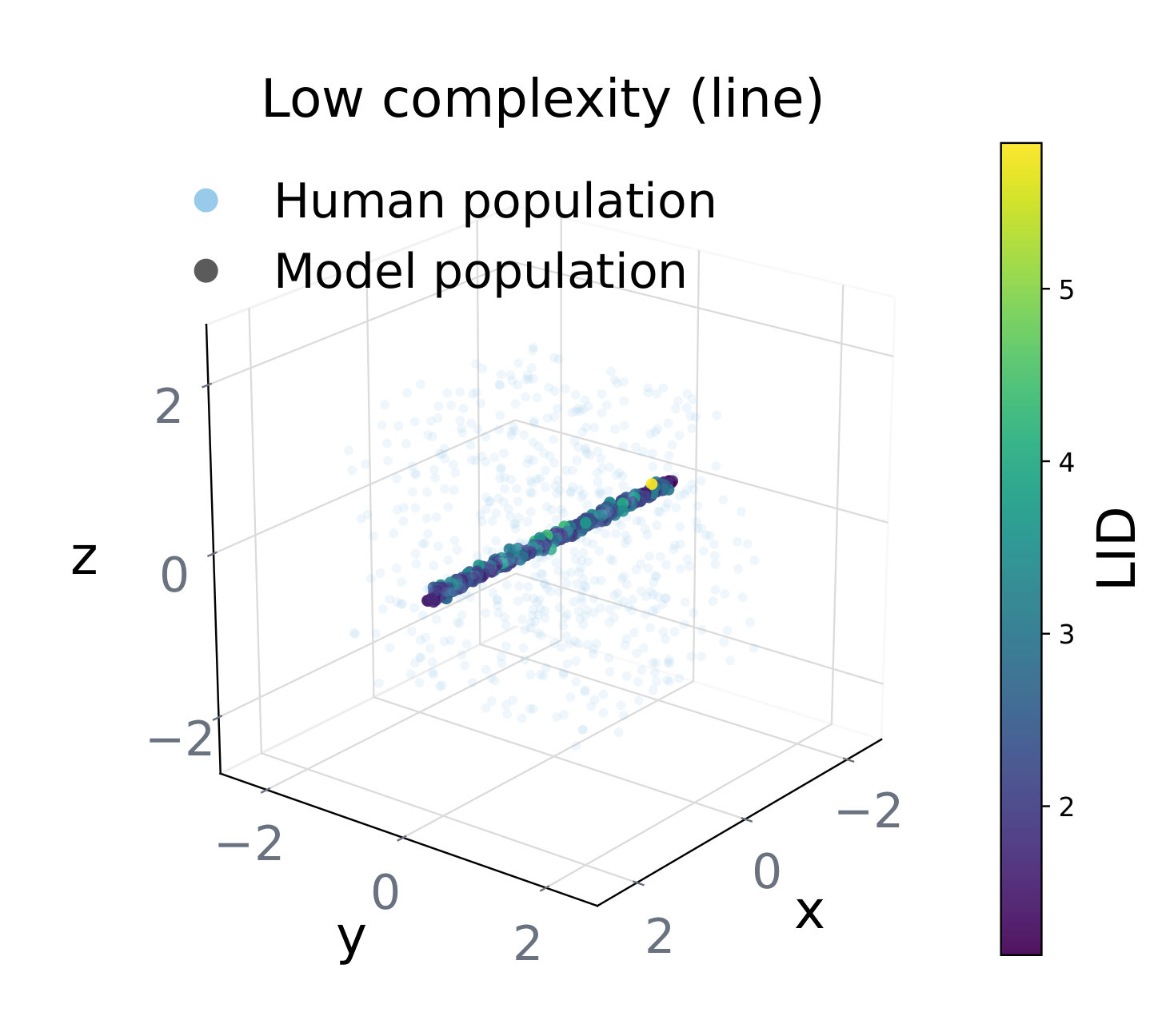 Local Intrinsic Dimensionality [?]: imagine 2,000 points along a line in a 44-D room. Coverage and Uniformity both look great — but intrinsic dimension is 1. All "diversity" is motion along one axis.
