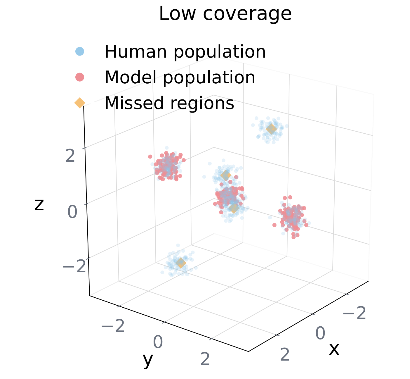 Fraction of human reference neighborhoods reached by at least one model-generated persona [?]. Low coverage means the model over-samples a modal region and neglects the tails.