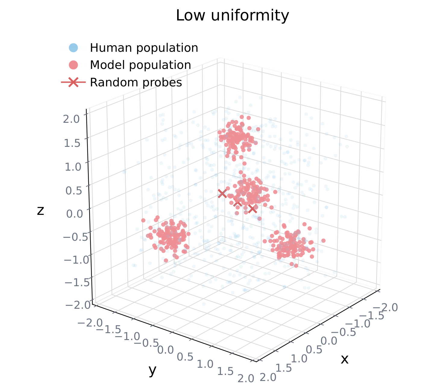 Hopkins statistic [?]: compares nearest-neighbor distances from data vs. random probes. Humans sit at H ≈ 0.5. Models either clump (H → 1) or grid-lock (H → 0).